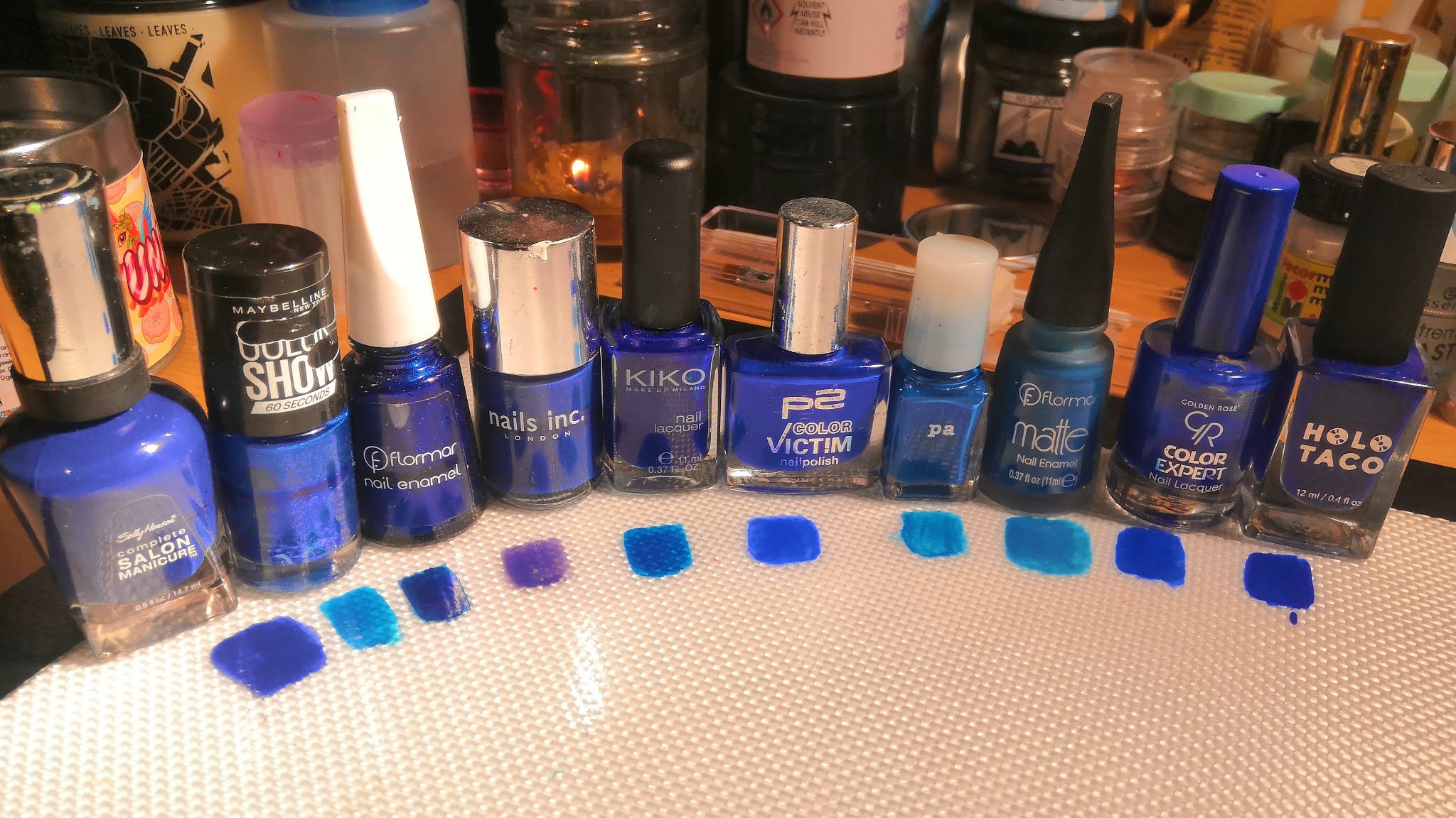 A big part of starting a new design is finding a good base colour. Blue is one of my favourite colours which is why I own a few too many blue polishes that are all slightly different. Finding a colour for this manicure was also a bit more complicated, because I sadly wasn’t able to receive a review copy, which means I did not have a chance to see the actual book in person, but had to rely on pictures I could find online… For this step I like to take out all polishes I think could work and paint a small square on a silicone baking mat. That way I can see how the colour changes when it dries and it also allows me to judge it’s opacity.